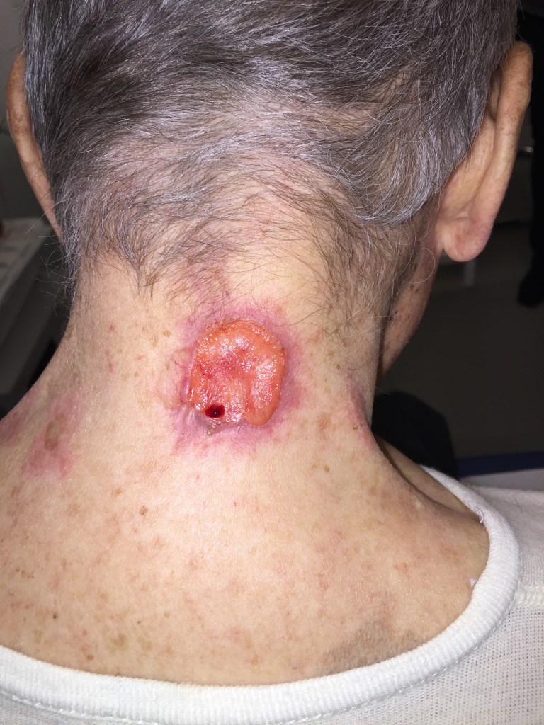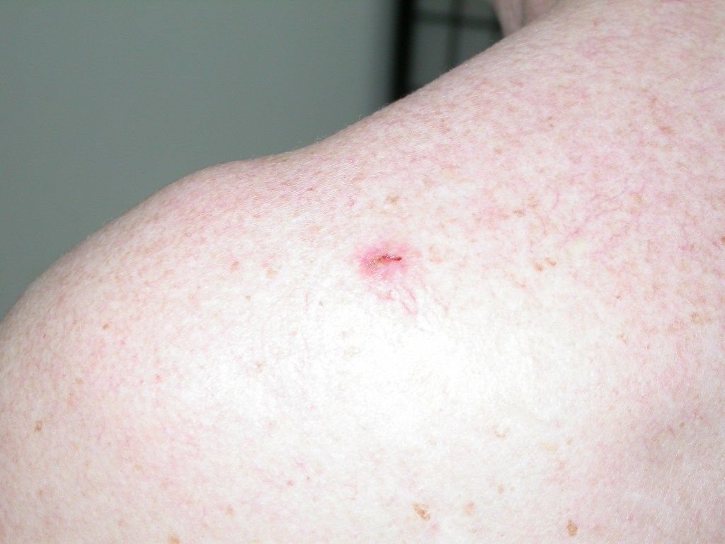 - Un nodulo translucido di colore bianco perlaceo o rosa in persone con la pelle chiara. In persone con la carnagione scura il nodulo può apparire marrone o nero. Possono essere visibili a occhio nudo dei piccoli vasi sanguigni che ricoprono o circondano la lesione. A volte la lesione può sanguinare o essere ricoperta da una crosta.
