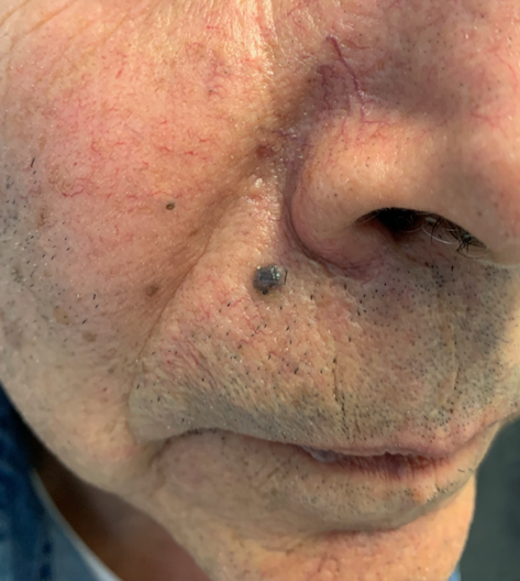 - Una chiazza marrone, nera o blu – o una lesione con macchie scure – con un bordo leggermente rialzato e traslucido